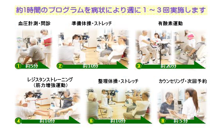 心臓病をお持ちの方の再発防止や社会復帰を目的として、運動療法、薬物療法、食事療法、禁煙などの生活習慣の改善を行っていく総合的なプログラムです。継続して行っていくことで、より良い効果が発揮されます。医師・看護師・理学療法士・薬剤師・管理栄養士などからなる多職種の専門スタッフが協力し、患者様一人一人の病状や体調に合わせた指導を行っていきます。