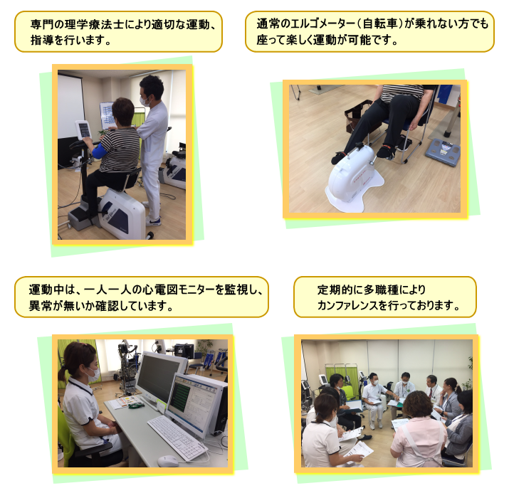 運動療法(エルゴメーター:自転車)やレジスタンストレーニング(筋力増強トレーニング)はもちろん、生活指導、服薬指導、栄養指導を積極的に行います。当院は、平成30年4月より、心臓リハビリテーションを開設し、入院での心臓リハビリの継続や退院後の通院での心臓リハビリを積極的に実施することで、患者様に快適で質の良い生活を維持していただき、心臓病による再入院を予防し、健康寿命を延ばしていただきたいと考えております。