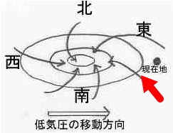 低気圧の中心が近づくにつれ、南東から北西に向かって風がふくようになり、雲も北西に流れやすくなる。だから、雲が北西に動くようになると低気圧がおおうようになり、雨が降りやすくなる。