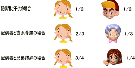 | 配偶者と子ども | 1/2 | 配偶者=1/2X1/2=1/4 子ども1人あたり=1/2X1/2X1/人数 |