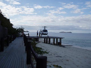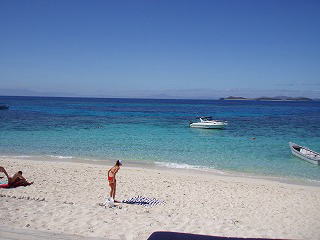 テラス前のビーチ、焼いているヨーロピアンがいっぱいいます向こうにはマナ島が、その後ろにマロロ島が見えます。