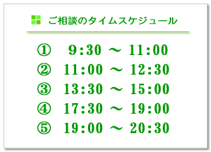 ![]() ・左記のタイムスケジュールからご相談の 希望時間帯をお選び下さい。 ・土曜日の時間帯は@Aで終了です。 ・ご相談時間は皆さん凡そ1時間程度ですが、 1時間30分までご相談が出来ます。 ・ご不明な点はお気軽にお問い合わせ下さい。