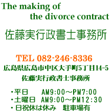 離婚についての書類作成専門家にご相談ください。離婚問題、不倫、浮気、養育費・慰謝料などの不払いについて 悩んでおられる方がとてもたくさんおられます。 大切なことは、きちんとした書面・契約書を作成することです。 一人で悩まずに、佐藤事務所にご相談下さい。 親権・養育費・慰謝料・浮気・不倫など、協議書・公正証書・ 示談書等の作成を通して、広島で離婚・不倫関係の書類作成で悩んでいる方のお手伝いをします。 なぜ離婚をするのですか? それは、これからの生活、そして将来を今よりもっと良いものにす る為だと思います。 自分の将来を大切にして下さい。 そしてなにより、子供たちの将来を大切にしてあげて下さい。 その為には、話合いで決まったことを、きちんと書面にして、 離婚協議書、そして公正証書を作成して下さい。 日々、多くの方から離婚関係書類作成のご相談を頂いております。 私たちがお手伝いします。一人で悩まないで、ご相談下さい。 行政書士 佐藤実 離婚相談について、詳しくはこちらから 離婚のメール無料相談もあります。詳しくはこちらから