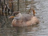 [1]カイツブリ 水面に浮かぶ小さな カモに似た鳥。 |