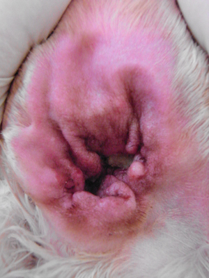 外耳炎により赤くただれた耳