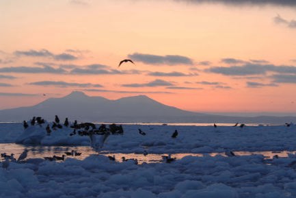 国後島羅臼山と流氷とオオワシ・オジロワシ