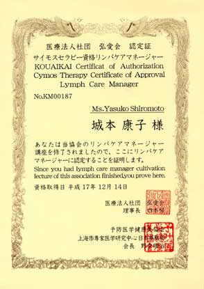 合わせて2001年10月〜2007年3月迄、ひろしま社会保険センターにて気功講座講師を勤める。 2007年3月末日、ひろしま社会保険センター閉館にともない、 2005年12月に医療法人社団 弘愛会のサイモスセラピー資格リンパケアマネージャーを取得。 以来、低線量ホルミシス効果のある岩盤浴にリンパケアトリートメント、そしてベテランの域に有る気功施術を合わせ三位一体・究極の癒しをめざす。 ☆空手道2段位。 |