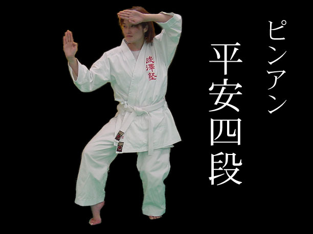 ピンアン4段の型は前蹴り・膝蹴り等、ピンアンの型の中では比較的、蹴り技が多く使用されています。