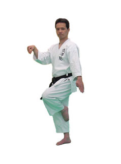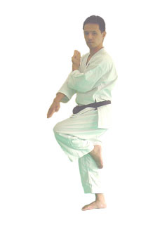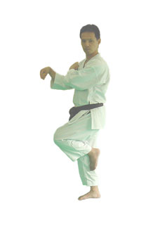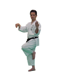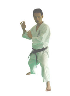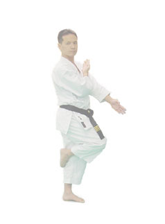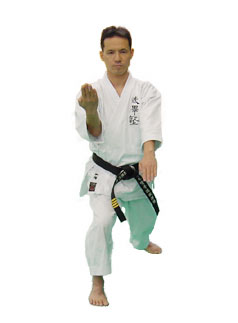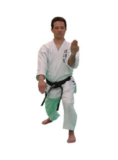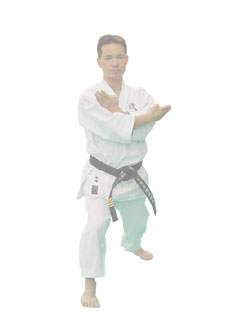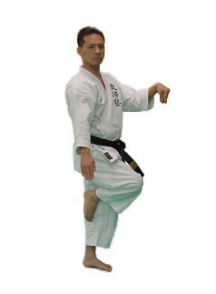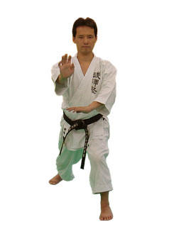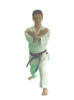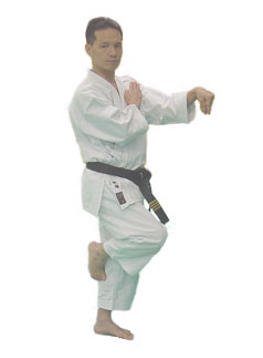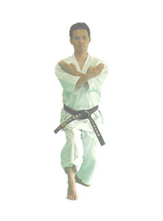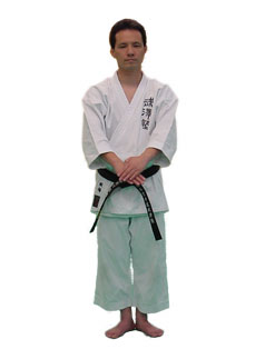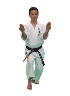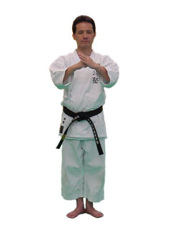 結び立ちにて、丹田の前に両手を重ね合わせる。 |