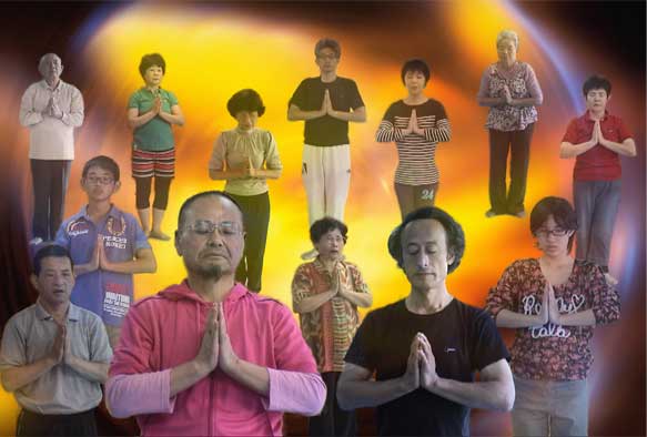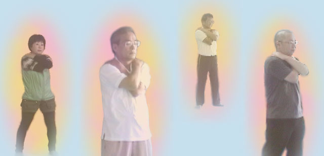 両掌をそっと合わせ、親指の峰は胸腺に。そして、自分の鼻の頭を心静かに見つめていると、丹田が観えてきます。その丹田に気持を置いて呼吸法を繰り返すと、合わせた両手は熱く熱くなってきます。からだは足元から立ち上る気に包まれ、えも言われぬ心地よさに浸り切ります。 そののち、指先は天に引っ張られるように伸びていき、それにつれ背骨も気持よく伸びます。続いて全身、四方八方に引っ張られるように解放され、合わせた踵を開き三元に戻ります。これは瞑想呼吸法に入る前のウォーミングアップとなります。健康効果的にみると、これだけでも、計り知れないほどの効果を期待できます。 |