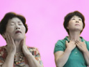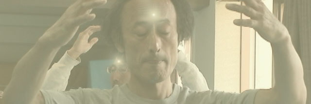 掌から眉間の奥、視床下部に気を送ります。掌で柔らかく圧縮するように送ると、脳の真中あたりでコツンコツンと、空気の当たりのように感じます。視床下部からセロトニンが分泌されます。 そして次に、両手の位置はそのままで、額を左右に振りながら眉間から吹き出る気を掌でキャッチします。掌に風穴があいたように強く感じます。 |
