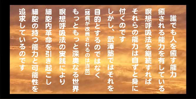 白隠禅師(江戸中期)が、「これで治らない病があったら、ワシの白髪首をやる」と言われたほど、たしかに凄い行法です。 武澤塾では、瞑想呼吸法で膨らんだ気エネルギーの実感をもってこれを行うため、効果倍増です。 |