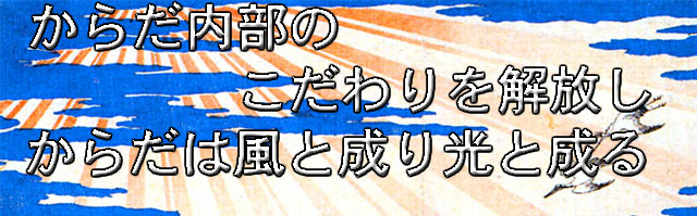 「ゆるめては捻り、捻ってはゆるめ」とあらゆる働きかけで身体内部のしこり、滞り、詰まりを解消すると、からだはパイプのように筒抜けと感じられ、からだ内外清涼感のある気の風が渦巻くようになります。その気の風を味わいながら瞑想呼吸法をくりかえすと、エネルギー純度は研ぎ澄まされ、密度がMAXに達し、光りSparkとなります。それは細胞のもつ能力なのです。 |