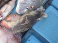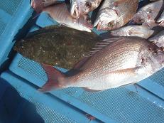 中潮!11時30分満潮。4名乗船。釣り場は湯島裏!今日は朝からず〜っとパラパラ、こびき、中ダイとヒットしていた!集中して入れ食い状態はなかった。久々に2年ぶり?くらいにこられた上田さんに1.5キロ前後の真鯛がヒット!!宮本さんにも1キロ前後のひらめがヒットしたがタモ入れに失敗!惜しまれる1枚だった。その後もパラパラ釣れ続け全部で40枚前後でした。内訳は、1.5キロ 2枚、1キロ 2枚、中ダイ 3枚、こびき