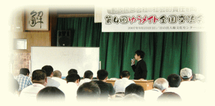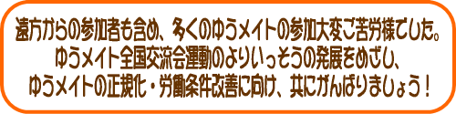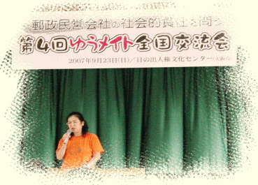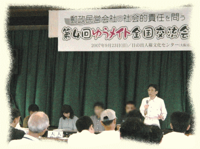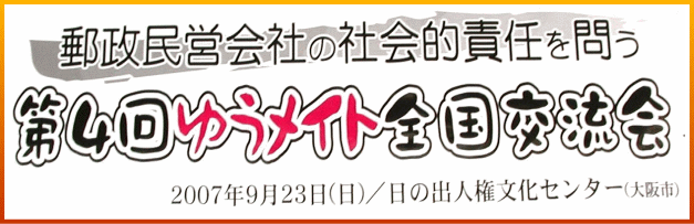 毎年10月に開催されています「ゆうメイト全国交流会」は、今年は10月からの郵政民営分社化を目前にして、9月23日大阪市日の出人権文化センターにおいて開催されました。