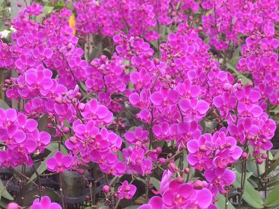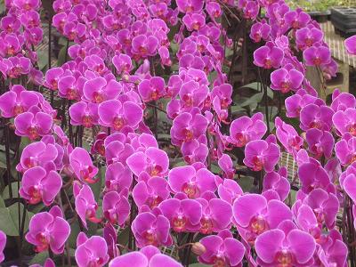 ハウスの中は、まさしくコチョウランが開花のピーク。 色鮮やかなコチョウランが所狭しと出荷の準備を迎えています。久しぶりの晴天で開放されたハウスは風通しも良く、よりいっそうコチョウランの花色が日光に映えていました。以下、ほんのわずかですがコチョウランの開花の様子です。