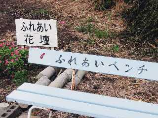 「ふれあい花壇」に「ふれあいベンチ」。よく見ると「ふれあいブロック」が転がっています。咲いているのは「フレアイソウ」でしょう。きっと。