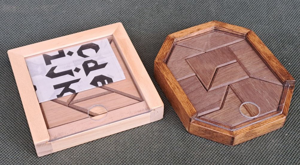 玩具シリーズ第9弾 シルエットパズルとは、様々な形のピースを組み合わせて形を作るパズルで、世の中には様々な種類が考案されて公開、あるいは販売されています。 <タングラム> ---------------------------------------------------------- もっともポピュラーなシルエットパズルで、正方形を7つのピースに分割したもので、19世紀頃の中国発祥といわれています。 その後世界中に広まって、子供のころ遊んだ経験がある人はかなりいるのではないでしょうか? 下の写真が完成品で、ピースがケースから逃げ出したところ???