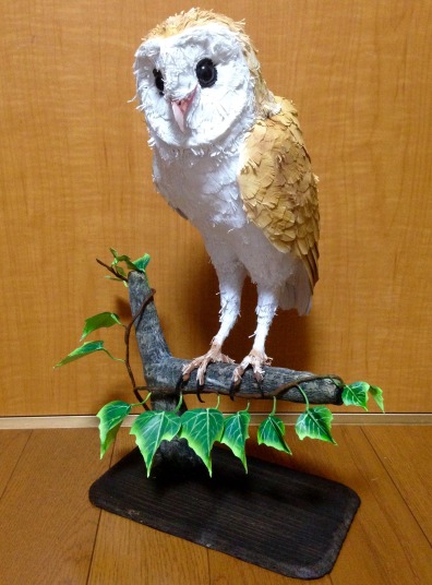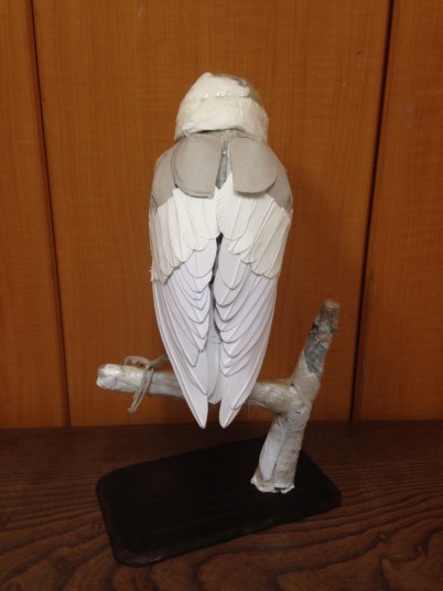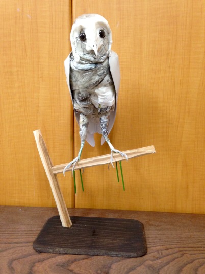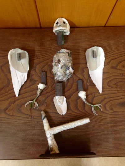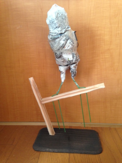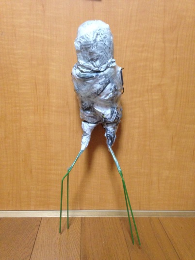 制作は工作用紙・針金等で各部パーツ芯を制作→新聞紙を巻き付けて肉付けしセロハンテープやビニールテープで固定します。