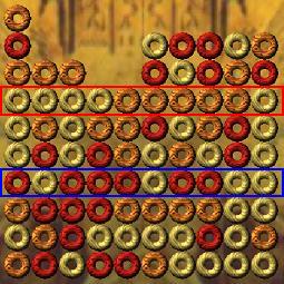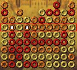 また@のリングを使うことで、右から4列目、5列目が1段ずつ下がるので、緑枠のオレンジが下がり、赤枠でのオレンジリング8個のハサミ消しの完成が目前になります。