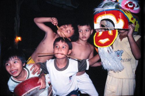 街で夕飯を食べていると、外からなにやら太鼓の音が。 しばらくするとお祭りの練習中(?)の子供達が現れました。 2003.9 ベトナム ホイアン