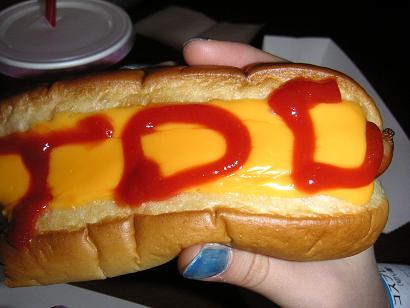 一旦横一線にケチャップをかけたあと、慌てて「カンダ」と書き直したたまごドッグ。