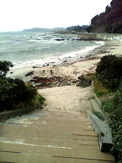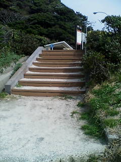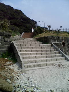 翔くんの登った階段。(3話で登場) ドラマでは右手になにか小屋っぽいものが映ってましたが、多分セットだったんでしょうね。 実際はほんとに、なにも無い浜辺でした。 |