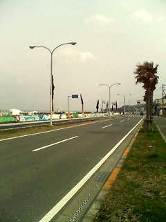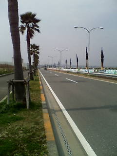 翔くんが冬海をバイクの後ろに乗せ、何度も走ったあの道です。 辿り着いた途端、頭の中でユーミンの「瞳を閉じて」が流れ出しました。 この時は街路樹がシートに覆われてたから、ちょっと感じが違うんですけど…海沿いで、塀のところがペイントされてるこの道路。 車の通行量は少なめで、なんだか外国のどこかみたいな感じがちょっとしました。 |