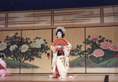 執着獅子は花魁の姿で踊ることも ありますが、この時は前に所属していた 流派の家元の好みで、お姫様姿 同じ色の内掛けを脱ぎ、かなり 動きが楽になってきました でも、今度は両手に持った獅子が 重い!!! 2歳から踊っていた私と違い 妹の日本舞踊デビュー戦でした 後姿の胡蝶が妹です |