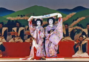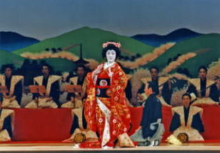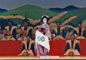 手鞠唄を踊った、上記の写真の後 女性が成長した女心を表現する クドキになります クドキはその踊りの一番表現したい 部分のことを指します ここでも桜子は後から登場! クドキはしっとり・ねっとり 表現しなければなりません 見ている人は眠くなる場面です^^ |