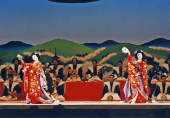 ≪二人道成寺≫は一人立ちの場合 白拍子 花子の踊りですが この舞台は二人立ちなので 白拍子 桜子も加わります この写真の時には すでに桜子は舞台袖に引っ込み 衣装を着替え中ですが、花子は 舞台上で衣装の糸を抜きながら あっという間に下に着ている 水色の振袖に変わります それを引き抜きと呼びます |