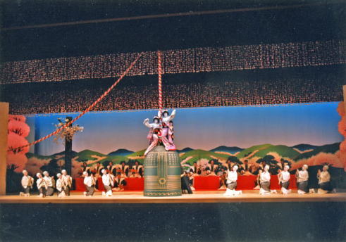 小坊主達を振り切って鐘に登る 鐘の上は狭いから見得を切る形にするのが大変^^ 舞台の上からお客様の顔はよ〜く見えているのです |