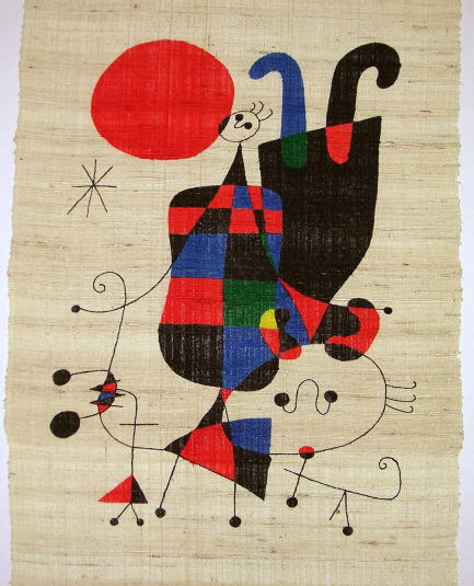 生成りの山繭帯地に、ミロの絵をマスキングを利用し手描きで染めた帯です