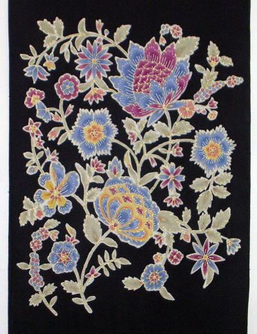 技法 | 梨地緞子帯地に、花更紗を手描きで染め、模様をロー伏せしてから濃いグレーで 地染めした帯です そのままでも綺麗なのですが、少し寂しい感じになるので一部分を金線で描いて あります |