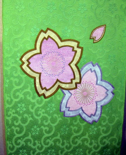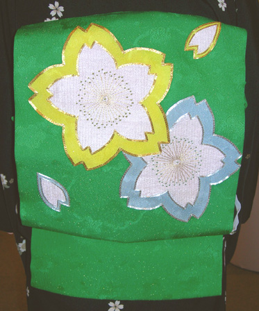 更紗柄の帯地に大きな桜の花を刺繍であしらった、大胆なデザインの