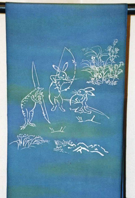 塩瀬にローの線描きで鳥獣戯画を表現した名古屋帯