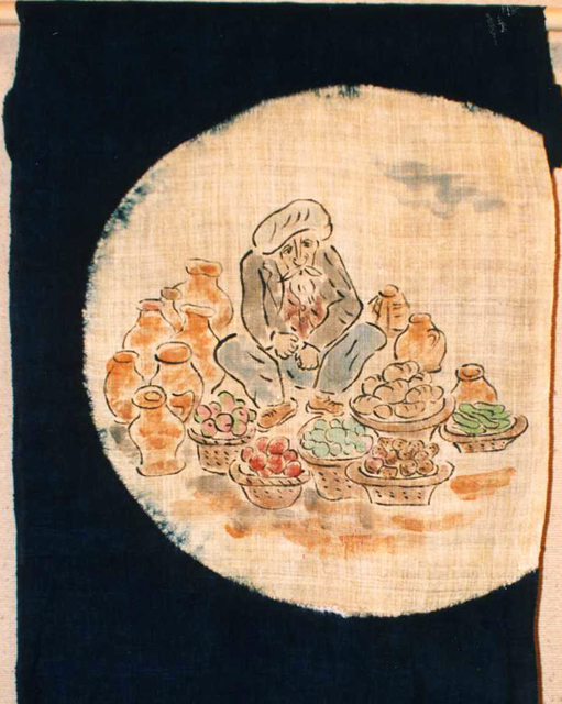 麻地の布に帽子絞りで丸を括り藍染めし、その中に異国の市場を墨描きし