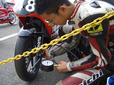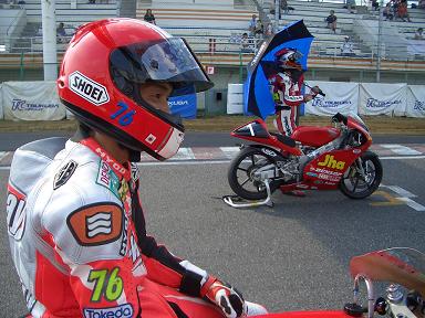 スタ前で慌ててウォーマーを外し エアを調整する次期国際ライダー お前が説教だな・・・(笑) |