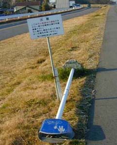 自転車・歩行者優先標識が倒れている傍らに、傾いた お役所の掲示があります。こんな状態になってから、少 なくも半年くらいにはなります。 添え木をしてあるなど掲示は、臨時応急の姿です。 (場所:木曽川左岸堤防)
