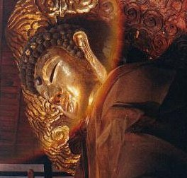 正法寺(岐阜市内)の大仏様、身のたけ13 M余りで日本三大仏のひとつとか。木骨に 竹を編んで形を作り、粘土を塗り固め、経 文を記した紙を貼り、漆を塗って金箔で仕 上げてあるそうです。