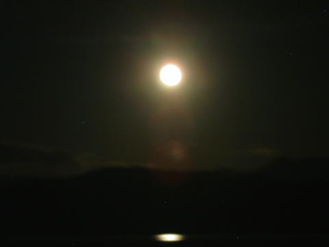 満月ではないのですが、ちょうど山の端から月が昇ってきました。湖面は鏡のように静かで波もなく、月の影が2つ映っています。