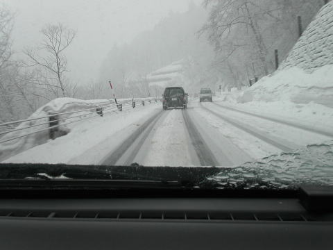 AM11:00出発。来た道を戻ります。R471を登っていくと降ってくる車はみんな真っ白。雪なのかな。と思ったら。