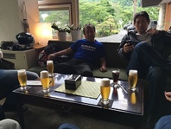 ←Ninjaトラブルで宿へ直行 本日の宿”富士レイクホテル” まずは、ロビーで乾杯! |