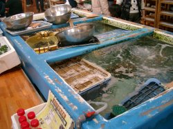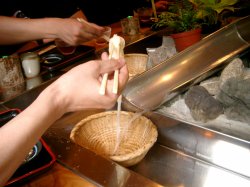 本日のメインイベント もみじ苑の流しそうめん (食べ放題1,000円 /つゆのおかわり350円) ↓ 実用新案を取得しているらしい 流しそうめん装置の裏側 |