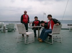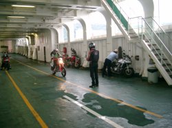 フェリーで談笑。 バイク走行中は会話ができないから フェリーはいいね。 |