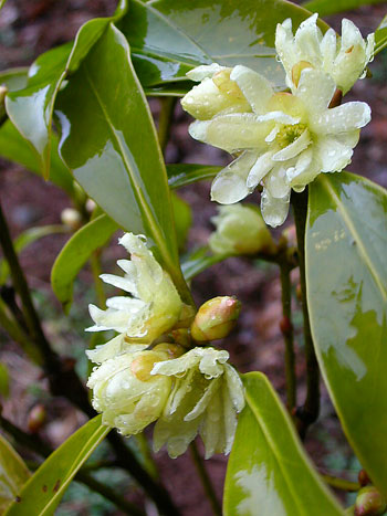 特長 | 果実が重なってつくからシキミ(重実)。果実に猛毒があるからシキミ(悪実)などがある。高さ2〜5mの常緑小高木。花は直径3cmほどで 花びらは約15枚。葉や樹皮は 粉末にして香として使う。 |