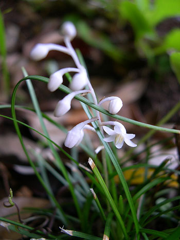 特長 | 別名リュウノヒゲ。細い葉を蛇や竜にたとえたもの。山野の林内に生える多年草。花茎はやや扁平で白色または淡紫色の花を総状につける。 |
