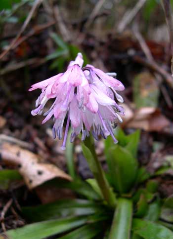特長 | 山地の谷沿いや林野の湿った所に生える多年草。根生葉はロゼット状につき倒被針形で長さ5〜20cm。花被片は淡紅色〜濃紅紫色。稀に白色。 |