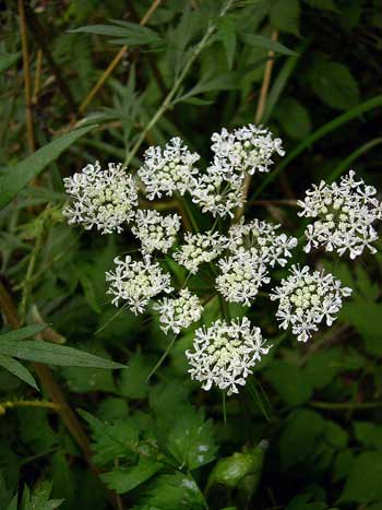 特長 | 山地の林縁に生える多年草。高さ0.8〜1.5m。葉は3〜4回3出羽状複葉で、小葉は長さ3〜6cm、鋭い鋸歯がある。枝先に複数形花序を多数つける |