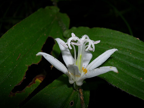 特長 | ホトトギスの白花です。山野のやや湿った所に生える多年草。茎は普通分枝せず、0.4〜1mになり、崖などに生えるものは垂れ下がる。花は葉腋に普通1〜3個ずつつき上向きに咲く。 |